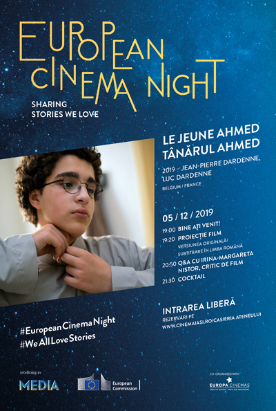 În seara de 5 decembrie 2019, Cinema Ateneu vă invită la o proiecție specială în cadrul European Cinema Night, un eveniment dedicat filmului european, care se desfășoară în perioada 2-6 decembrie 2019, în 54 de orașe din Europa, ajungând la peste 14.500 de spectatori. În avanpremieră, va rula filmul „Tânărul Ahmed / Le jeune Ahmed”, regizat de Luc și Jean-Pierre Dardenne, recompensat cu Premiul pentru regie la Cannes și distribuit în România de Independența Film.